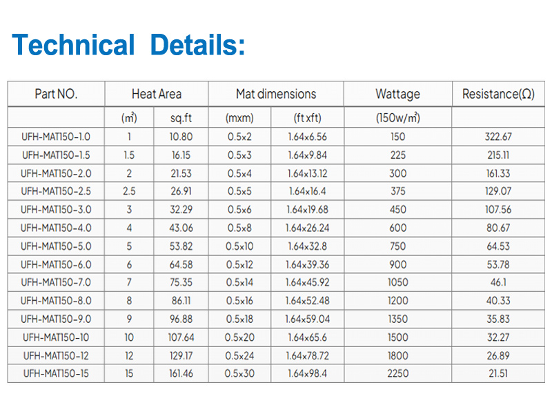 UFH-MAT PRO besteht aus drei verschiedenen Komponenten: Fiberglas, Heizung Element und 2,5 Meter Standard-Kaltkabel. Es ist für fast alle Bodentypen geeignet, einschließlich Keramikfliesen, Steinfliesen, Holzfertigparkett, Laminatboden usw.